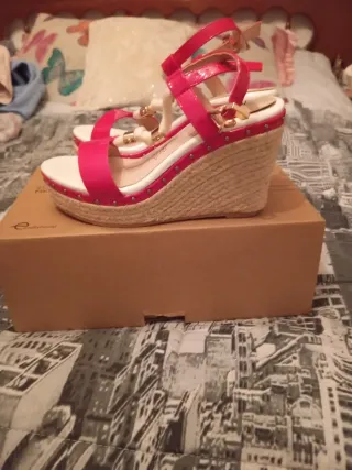 Sandalias de cuña para mujer, con un diseño moderno y cómodo. - Tiras ajustables con hebilla. - Detalle de tachuelas decorativas. - Suela de esparto.