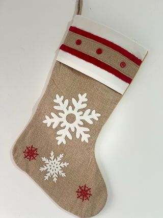 Calcetín de Navidad con un diseño invernal de copos de nieve. Perfecto para añadir un toque festivo a tu hogar. 47cm - Material de lino con apliques de copos de nieve. - Detalle de cintas rojas y botones en la parte superior. - Diseño con copos de nieve blancos y rojos.