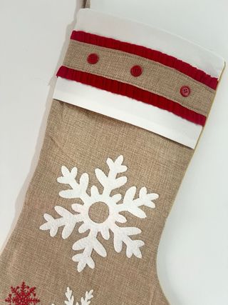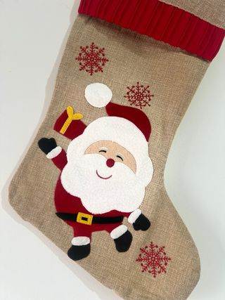 Calcetín navideño con diseño de Santa Claus. 47cm - Parte superior de tela de arpillera. - Puño de punto rojo acanalado. - Adorno de Santa Claus aplicado. - Detalles de copos de nieve bordados.