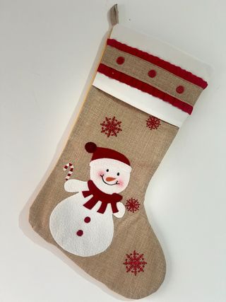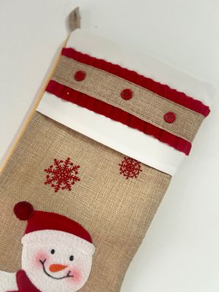 Calcetín navideño con un simpático diseño de muñeco de nieve. 47cm - Material de tela de yute. - Adorno de muñeco de nieve con bufanda y gorro. - Detalles de copos de nieve bordados. - Parte superior con banda blanca y detalles rojos.