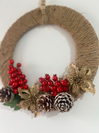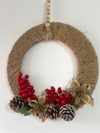 Corona artesanal para decorar en Navidad. Perfecta para colgar en puertas o paredes. 36cm - Base de jute. - Adornos de bayas rojas, piñas y flores doradas. - Cuelga con cuentas de madera.