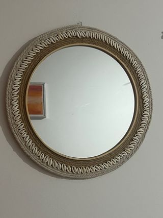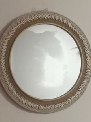 Precioso espejo redondo con un marco artesanal de macramé. HECHO A MANO 41cm diámetro - Marco exterior de cuerda. - Detalle de conchas marinas. - Acabado en tonos beige y blanco.