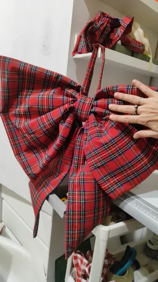 Este bonito lazo de tela con estampado tartán es perfecto para añadir un toque festivo a tu hogar esta Navidad. Su diseño en rojo y marrón lo hace muy versátil. 55 cm ancho 60 cm largo - Diseño de lazo grande. - Estampado tartán clásico. - Ideal para chimeneas, puertas o árboles de Navidad.