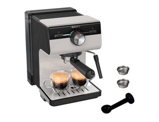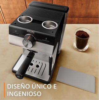 Cafetera espresso Krups manual con 15 bares de presión. Perfecta para preparar tu café favorito en casa. - Diseño compacto y elegante. - Incluye portafiltros y cucharilla dosificadora.