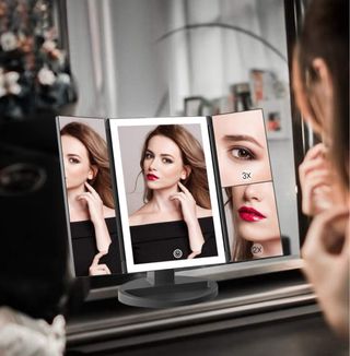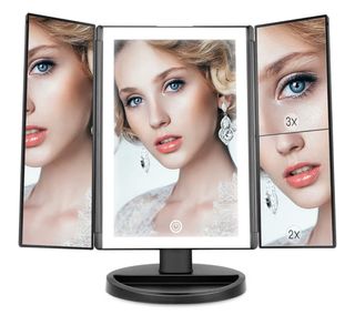 Espejo de maquillaje tri-fold con iluminación LED integrada. Ideal para aplicar maquillaje con precisión. - Diseño tri-fold con espejos laterales. - Iluminación LED para una visibilidad clara. - Base estable para colocar sobre superficies.