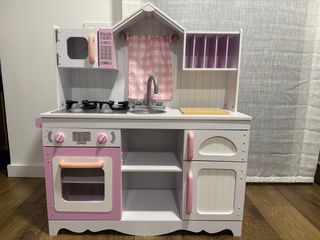 Divertida cocinita de juguete de la marca Kidkraft en color rosa. - Incluye microondas, horno y fogones. - Dispone de fregadero con grifo. - Cuenta con estanterías y puertas. - Incluye tabla de cortar de madera.