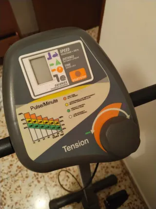 Bicicleta estática para ejercicio en casa. Su diseño es compacto y funcional. - Color principal gris con detalles en negro. - Manillar ergonómico. - Asiento ajustable. - Pantalla digital para seguimiento de ejercicio. - Manillar que flexiona también para hacer ejercicio de remo