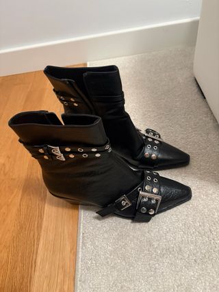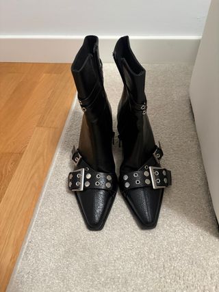 Botines negros de Stradivarius con un diseño moderno y detalles llamativos. - Puntera afilada. - Cierre de cremallera lateral. - Tira con hebilla metálica y tachuelas. - Tacón de altura media. -Puestos un día