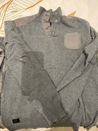 Jersey de punto para hombre con detalles de diseño. Da talla L - Cuello alto con botones. - Bolsillo en el pecho. - Parches en los hombros. - Puños y bajo de canalé.