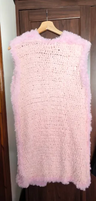 Chaleco largo de ganchillo hecho a mano, con un diseño único y moderno. Perfecto para añadir un toque especial a cualquier atuendo. La parte delantera es lana de pelo y la trasera con lana tipo peluche. Es muy suave