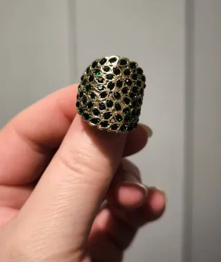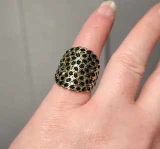 Elegante anillo con un diseño llamativo. - Metal con acabado dorado. - Decorado con múltiples piedras de color verde intenso.