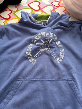 Sudadera azul del uniforme del colegio Leonardo da Vinci. Presenta el logo del colegio bordado en la parte delantera. - Sudadera con capucha. - Bolsillo canguro.