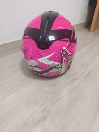 Casco de moto HJC en talla S con un diseño llamativo en rosa y negro. - Diseño con salpicaduras y detalles gráficos. - Visera transparente. - Cierre de seguridad.