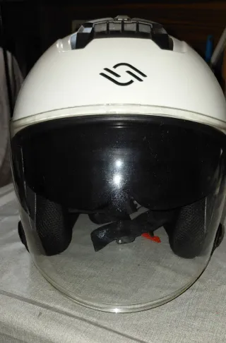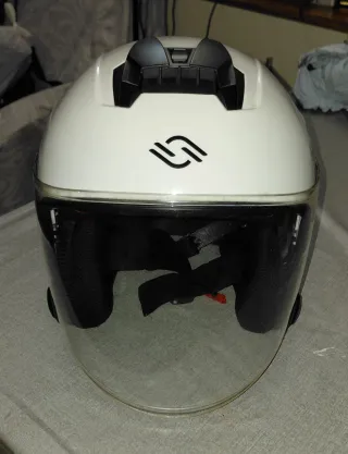 Casco de moto estilo jet, ideal para trayectos urbanos. Su diseño abierto ofrece comodidad y buena ventilación. - Color blanco brillante. - Visera transparente. - Visera para el sol. - Cierre de seguridad.