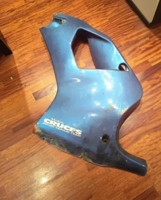 Tapa lateral izquierda para Aprilia RS 50 modelo Chester. - Color azul. - Presenta algunas marcas de uso y roces, como se aprecia en las fotos. - Incluye adhesivo Motos Cruces Indian Radical Team.