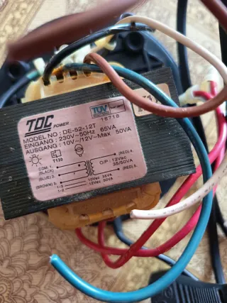 Transformador de potencia TDC. - Modelo: DE-52-12T - Entrada: 230V~50Hz 65VA - Salida: 10V~/12V-Max 50VA - Conexiones: COM. 1 (Negro), 2 (Azul), 3 (Marrón) - Salida O/P: 12Vac 35/50VA