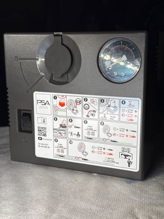 Compresor de aire para neumáticos de la marca PSA Groupe. Incluye manómetro para controlar la presión. - Diseño compacto y portátil. - Indicador de presión en bar y psi. - Interruptor de encendido/apagado.