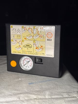 Compresor de aire para neumáticos de la marca Terra-S. Incluye manómetro. - Indicador de presión en bares y psi. - Interruptor de encendido/apagado. - Indicaciones de uso en la carcasa.