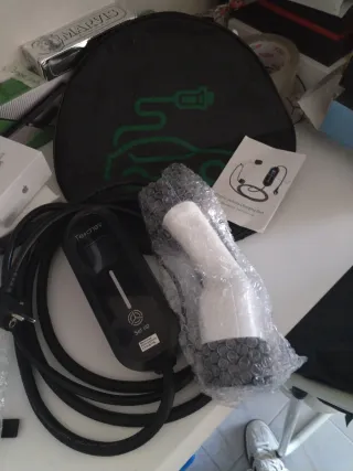 Cargador para coche eléctrico de la marca Teschev. Incluye bolsa de transporte y manual de instrucciones. - Cable de carga de alta calidad. - Enchufe europeo. - Bolsa de almacenamiento con diseño de coche y enchufe.