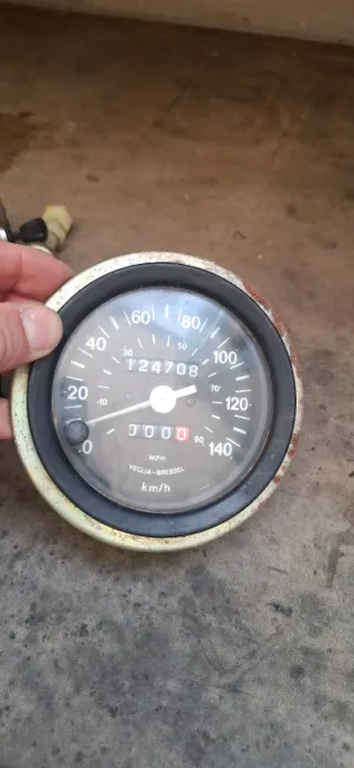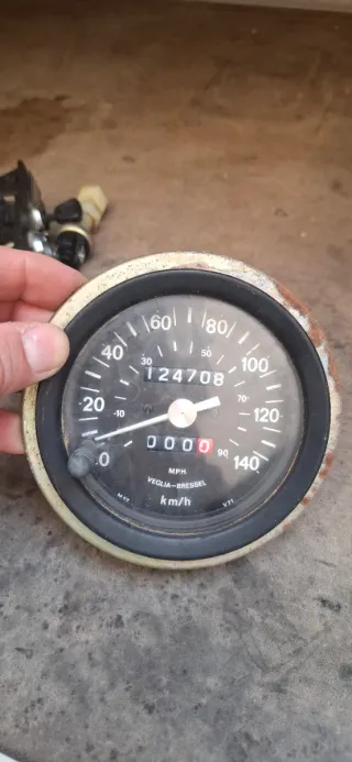 Reloj cuentakilómetros de la marca Veglia-Bressel, compatible con Ebro. - Indicador de velocidad en MPH y km/h. - Odómetro con lectura de 124708. - Indicador de parcial de 0000. - Marco exterior con signos de óxido.