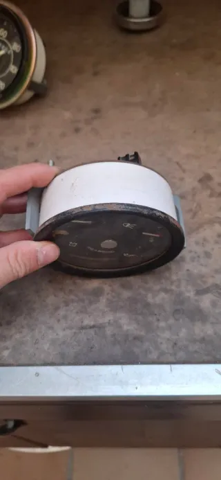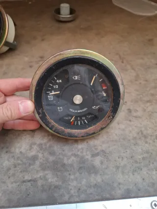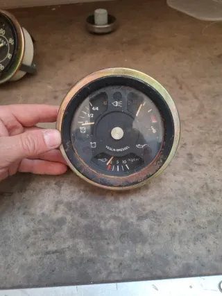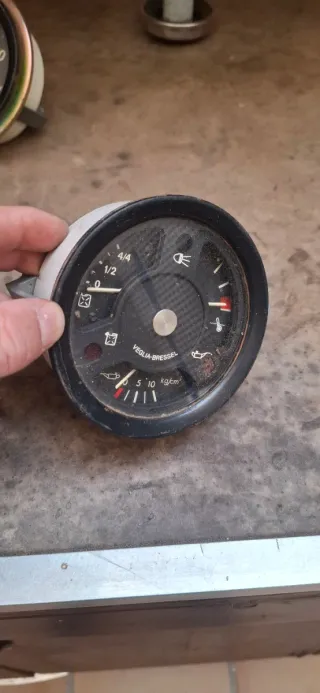 Reloj de tablero Veglia-Bressel para Ebro. Muestra indicadores de combustible, luces, temperatura y presión de aceite. - Marca: Veglia-Bressel - Indicador de combustible (4/4, 1/2) - Indicador de luces - Indicador de temperatura - Indicador de presión de aceite (kg/cm²)