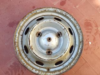 Llanta Firestone de hierro, modelo 4Jx15, compatible con Citroen 2CV del año 1970. Presenta signos de óxido superficial debido al paso del tiempo. - Marca: Firestone - Medida: 4Jx15 - Año de fabricación aproximado: 1970 - Material: Hierro - Color: Gris SOLO RECOGIDA LOCAL