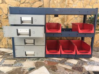 Mueble organizador de metal azul con cuatro cajones grises y varios cubos rojos. - Estructura metálica resistente. - Cuatro cajones con tiradores. - Múltiples cubos de almacenamiento rojos. --Mejor venir a verla para ajustar las medidas que tiene y negociar el precio....
