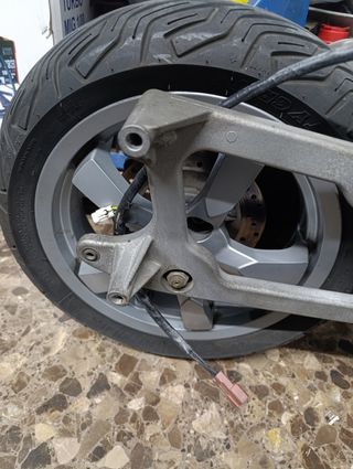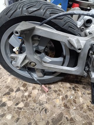 Soporte de escape para Peugeot Satelis 125. También hace función de basculante y soporte de rueda trasera. - Pieza metálica de color gris. - Incluye cableado con conector rosa.