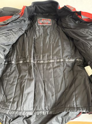 Chaqueta de moto LEVIOR en color rojo y negro, talla L. Diseñada para ofrecer protección y comodidad en tus rutas. - Combinación de colores rojo y negro. - Cierre frontal con botones a presión y cremallera. - Bolsillos laterales con cremallera. - Cuello alto con cierre. - Mangas con ajuste en puños.