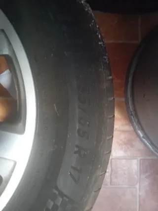 Conjunto de tres ruedas de coche. - Llantas de aleación plateadas. - Neumáticos de goma negra.