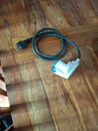 Cable de conexión para exteriores, ideal para campers y caravanas. Cuenta con un enchufe de seguridad y un conector robusto. - Color negro. - Conector azul y blanco.