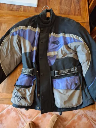 Chaqueta de moto Vintage - Combinación de colores negro, gris y azul - Cierre frontal con cremallera y botones. - Bolsillos frontales con solapa. - Cinturón ajustable en la cintura.