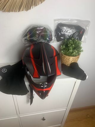 Casco de motocross con diseño deportivo en negro y detalles rojos. Incluye gafas con lente iridiscente y protecciones. - Casco de motocross. - Gafas con lente iridiscente. - Protecciones para manos.