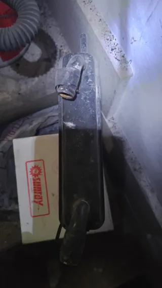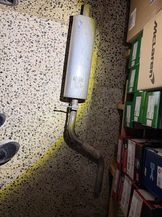 Tubo de escape de metal. - Silenciador de forma rectangular. - Tubo de conexión curvo.