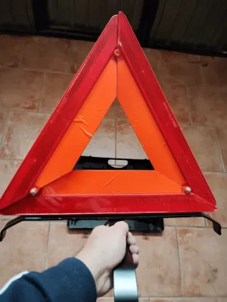 Juego de triángulos de señalización homologados para vehículos. Son plegables y fáciles de guardar. - Diseño triangular reflectante. - Material resistente. - Patas de metal reforzado. - Nuevos sin usar con funda maletín plástico duro para guardarlo.
