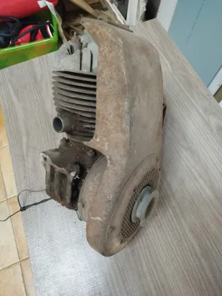 Motor de combustión interna, ideal para proyectos de restauración o como pieza de colección. Presenta un diseño clásico y robusto. - Cilindro con aletas de refrigeración. - Carcasa protectora metálica. - Componentes visibles de hierro fundido.
