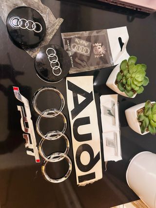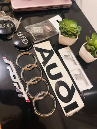 Se venden varios accesorios de Audi. Son ideales para personalizar tu coche. - Incluye cuatro emblemas de Audi para tapacubos, un emblema cromado para el maletero y dos pegatinas de Audi. - Los emblemas son de metal y están en buen estado. - Las pegatinas son de vinilo y están nuevas.