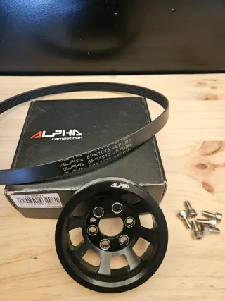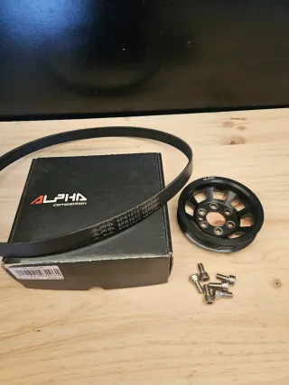 Polea de cigüeñal aligerada de la marca Alpha Competition. - Polea cigüeñal marca Alpha competition para motores 2.0 TFSI. - Diseño ligero para mejorar el rendimiento. - Incluye la polea, correa y tornillería necesaria para su montaje.