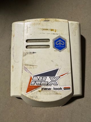 Tapa lateral para depósito de Vespino. Presenta un diseño con el logo de la marca en color azul y blanco. - Color negro. - Logo de la marca integrado.