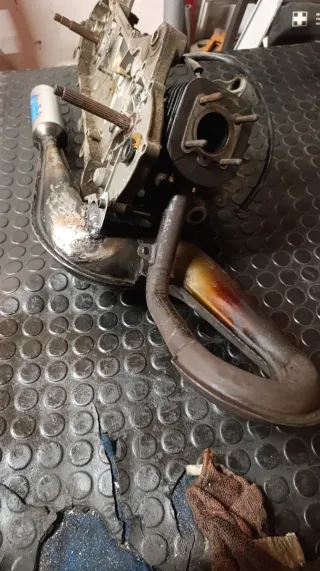 Escape Polini para Vespino. No tiene mucho uso, aún conserva barniz en casi todo el escape. Tiene reparación en platina de sujeción. Algún bollo por la parte inferior q no afecta al rendimiento. Incluye boquilla y muelle