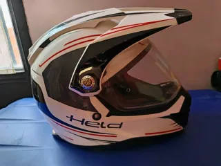 Casco de motocross de la marca Held, con un diseño llamativo en blanco, negro y detalles rojos y azules. - Visera aerodinámica. - Cierre de seguridad. - Interior cómodo.