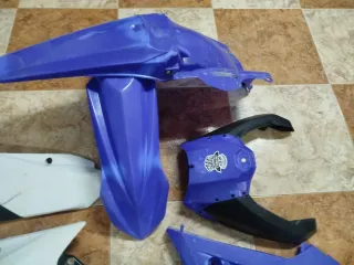 Conjunto de plásticos originales para Yamaha YZF. Portanumeros laterales y guardabarro trasero. - Color azul y blanco con detalles. - Compatibles con modelos 2014-2017.