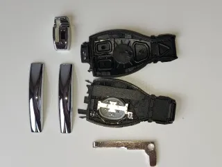 Carcasa de repuesto para mando de llave de Mercedes Benz. Diseño elegante con detalles cromados. - Botón de pánico rojo. - Símbolo de candado cerrado. - Símbolo de candado abierto. - Símbolo de maletero.
