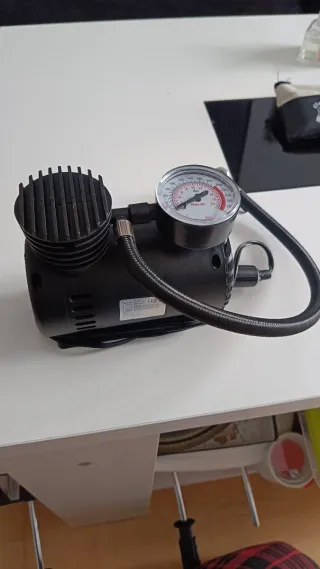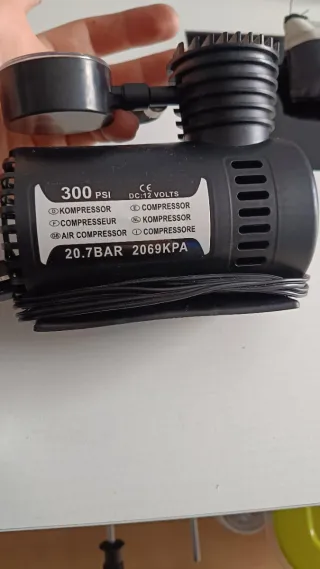 Compresor de aire portátil para vehículos. - Presión máxima de 300 PSI. - Funciona con conexión de 12V. - Incluye manómetro para control de presión. - Muestra la presión en PSI, BAR y KPA.