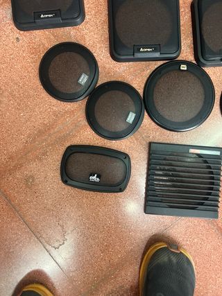 Conjunto de rejillas y protectores para altavoces de coche. - Variedad de tamaños y formas. - Diseños cuadrados y redondos. - Algunos protectores tienen la marca FUSION TEN visible.