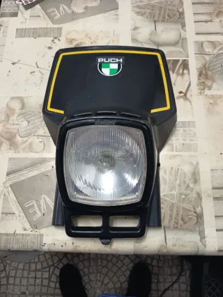 Vendo Careta con faro y portalamparas con cerquillo faro,para motos Puch en color negro. Presenta un diseño deportivo con detalles en amarillo. - Logo de Puch en la parte superior. - Marco amarillo alrededor del frontal. - Incorpora el faro principal. Posible Valido para derbi, Rieju,Torrot, suzuki,honda, yamaha, Montesa,óssa,Bultaco,gilera, mobylette,Ducati, KTM, etc..hago envíos por Wallapop o previo pago por bizum,transferencia o PayPal, no contrareembolso,interesados llamar o wathasap tlf.619101921, gracias y saludos