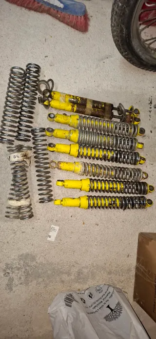 Set de amortiguadores betor para moto. Lo que se ve en las fotos. Para restaurar. Se vende todo el lote junto, no separo. Negociable. - Cuerpo principal de color amarillo. - Muelle de suspensión plateado. - Conexiones en ambos extremos.