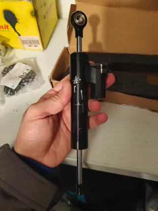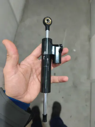 Amortiguador de dirección para motocicleta en acabado negro, no sé ha estrenado, se montó para probar pero no ha llegado a usarse como tal, incluido todo lo que se ve, no marear, repito, está nuevo, solo 2 roces instalando pero no me vale.