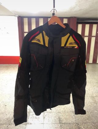 Chaqueta de moto MTECH PLATINIUM de corte 3/4. Usada tres veces, es una talla L aunque ponga XL. Tiene tres capas y ventilacion para verano. - Diseño en color negro con detalles en amarillo y rojo. - Marca MTECH visible en la parte frontal.
