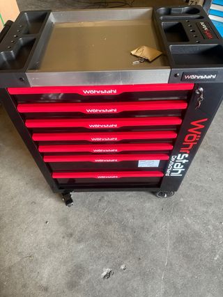 Carro de herramientas de la marca Wöhrstahl con siete cajones. Ideal para tu garaje. Calidad alemana! 75 kg de peso. 1.599€ en catalogo. - Color negro y rojo. - Ruedas para fácil movilidad.